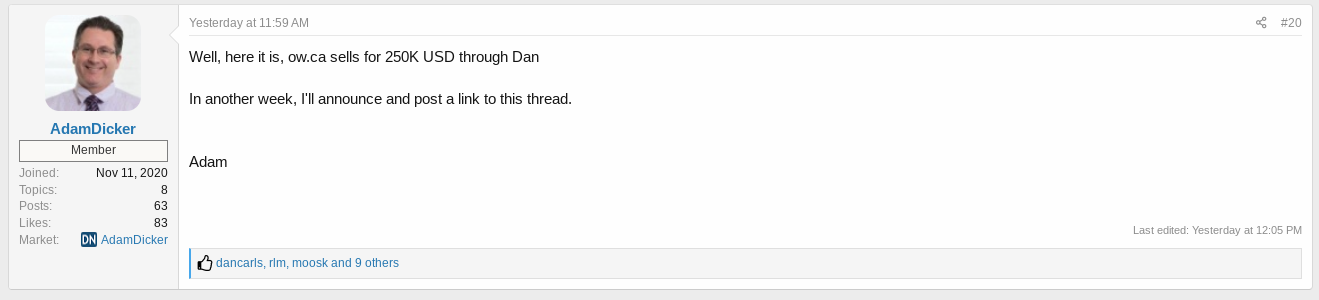 Adam Dicker shared some basic details of the domain name sale on the specialist Canadian Forum DN.CA, visiting the domain name takes you to Dan with the message that “There is a pending sale