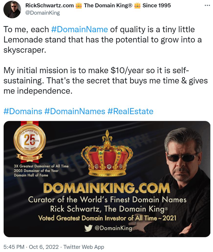 To me, each #DomainName of quality is a tiny little Lemonade stand that has the potential to grow into a skyscraper. My initial mission is to make $10/year so it is self-sustaining. That’s the secret that buys me time & gives me independence.