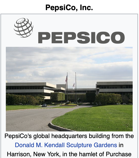 PepsiCo, Inc. is an American multinational food, snack and beverage corporation headquartered in Harrison, New York, in the hamlet of Purchase. PepsiCo has interests in the manufacturing, marketing, and distribution of grain-based snack foods, beverages, and other products. PepsiCo was formed in 1965 with the merger of the Pepsi-Cola Company and Frito-Lay, Inc. PepsiCo has since expanded from its namesake product Pepsi to a broader range of food and beverage brands, the largest of which included an acquisition of Tropicana Products in 1998 and the Quaker Oats Company in 2001, which added the Gatorade brand to its portfolio.