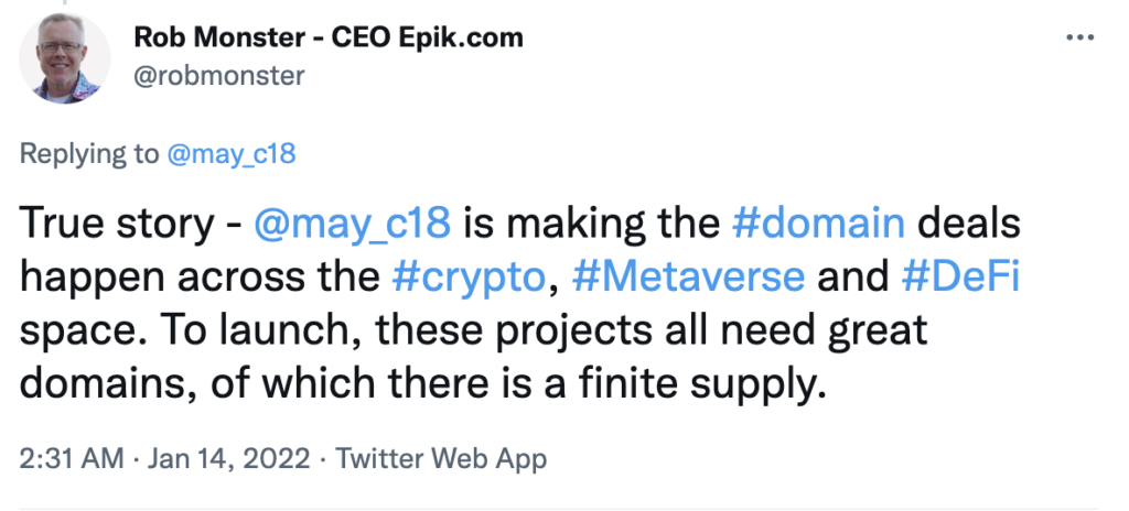 Rob Monster the CEO of Epik noted in the comments that “True story – @may_c18 is making the #domain deals happen across the #crypto, #Metaverse and #DeFi space. To launch, these projects all need great domains, of which there is a finite supply”