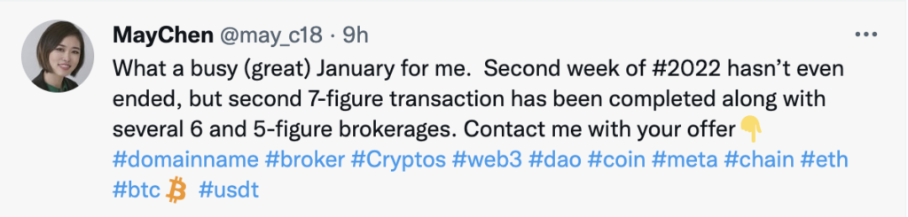 May Chen Domain Name Broker from Epik posted on her personal Twitter “What a busy (great) January for me. Second week of #2022 hasn’t even ended, but the second 7-figure transaction has been completed along with several 6 and 5-figure brokerages. Contact me with your offer#domainname #broker #Cryptos #web3 #dao #coin #meta #chain #eth #btc #usdt”