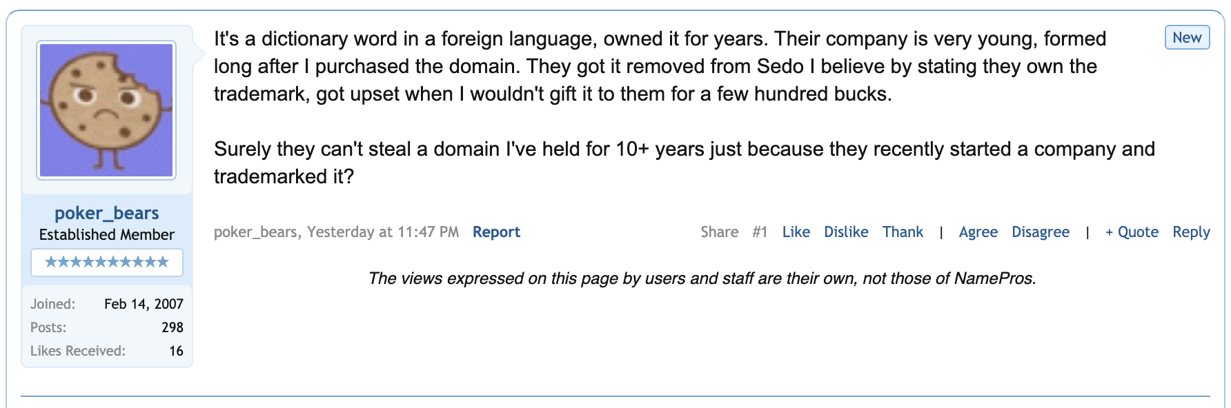 The thread is one where most people are saying just don’t park it / show ads, should win an RDNH if it goes via WIPO / UDRP – While I agree the points mentioned are well thought out, That doesn’t mean you are 100% safe, I would advise in the first instance be prepared… Keep all documentation regarding when you acquired the domain name, the offers you have received/declined, and then share this with a domain name attorney…