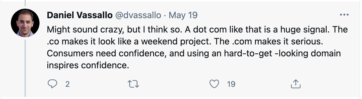 Happy Friday! An interesting post on Twitter by Josh Pigford, discussing the merits of acquiring a dot com domain for $300K because of the challenges of educating people about his Dot Co domain name not being a dot com!